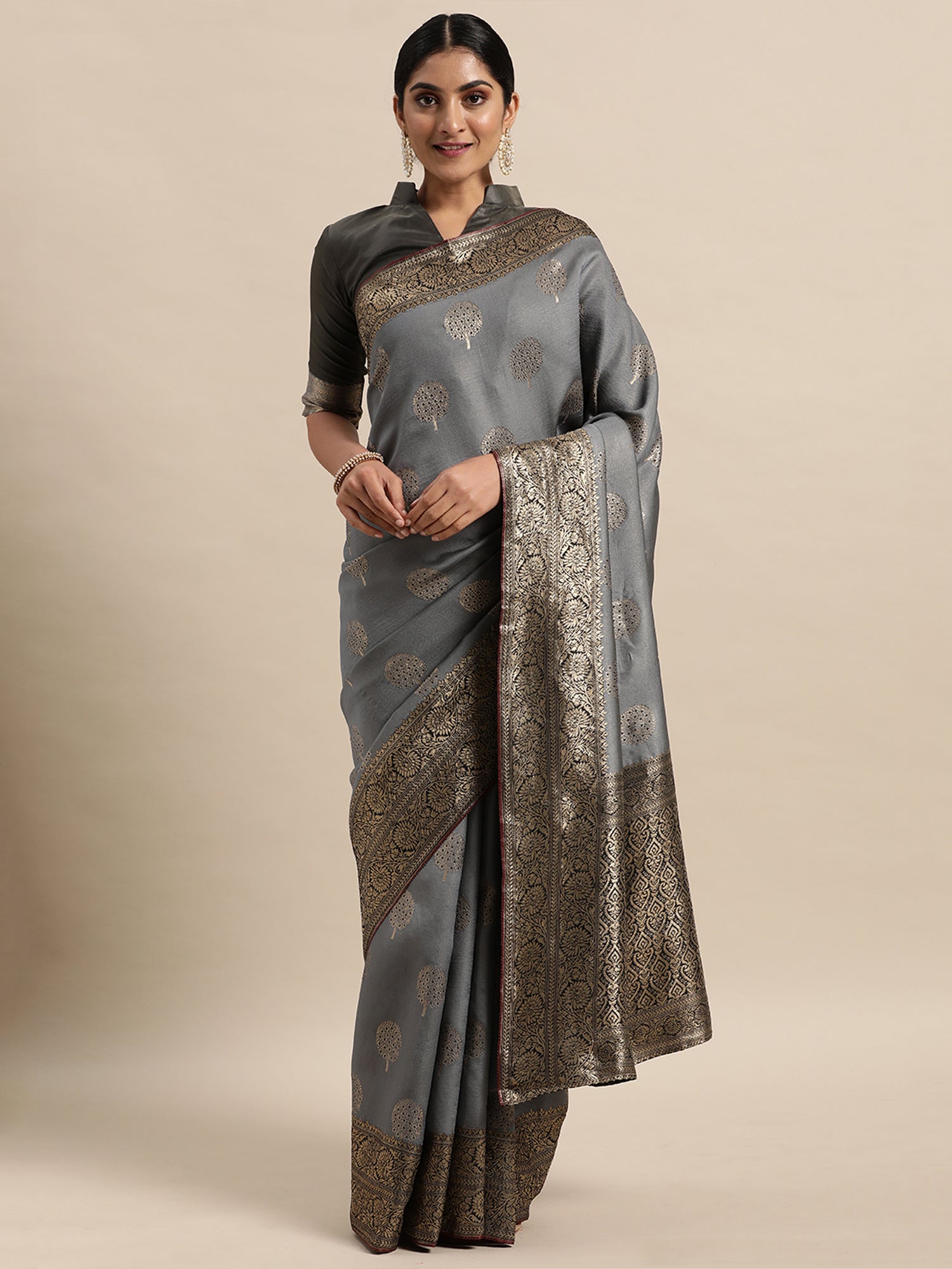 This saree from the house of Yora Ethnic is made from Silk Blend and is Grey in color. Yora Ethnic Ethnic Sarees comes With Blouse Piece, Which can be Stitched according to Your Taste and Preference. This Saree is Crafted by Skill Craftsmen without Compromising on its Quality. With This Beautiful Design and Fabric, This Saree will fetch You Oodles of Compliments and Praise. saree fit size is 5.5 mtr saree & 0.8 mtr blouse, Free Size |.