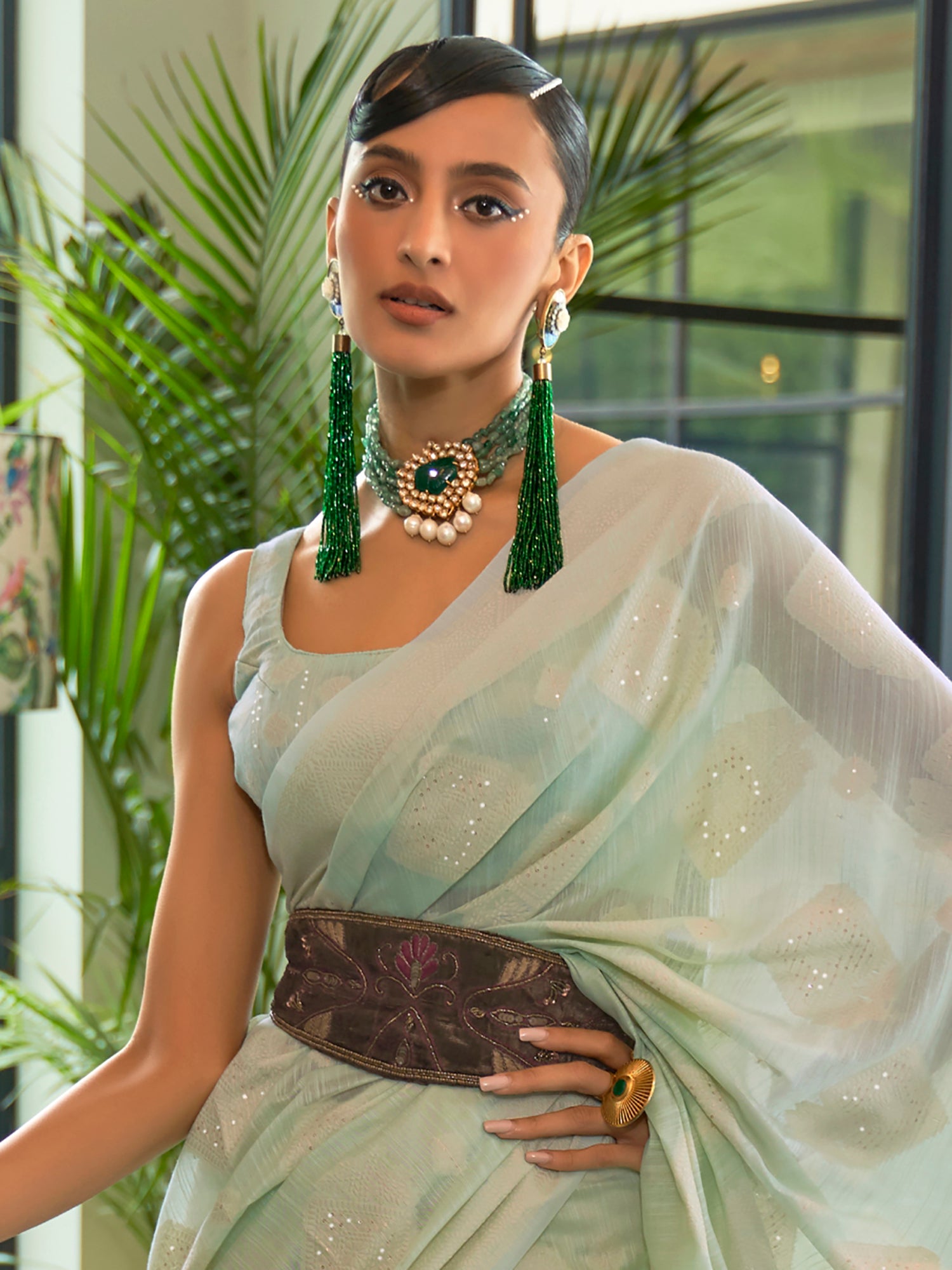 This saree from the house of Yora Ethnic is made from Silk Blend and is Green in color. Yora Ethnic Ethnic Sarees comes With Blouse Piece, Which can be Stitched according to Your Taste and Preference. This Saree is Crafted by Skill Craftsmen without Compromising on its Quality. With This Beautiful Design and Fabric, This Saree will fetch You Oodles of Compliments and Praise. saree fit size is 5.5 mtr saree & 0.8 mtr blouse, Free Size |chickankari sequins lucknowi weaving.