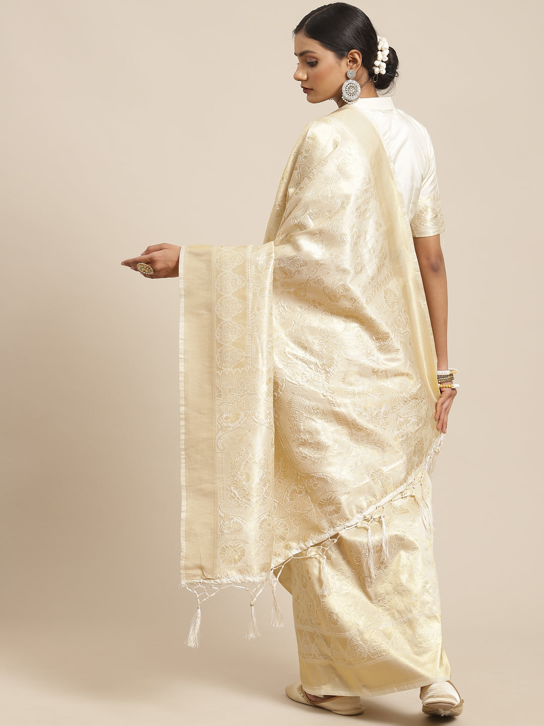This saree from the house of Yora Ethnic is made from Kanjeevaram Silk and is Cream in color. Yora Ethnic Ethnic Sarees comes With Blouse Piece, Which can be Stitched according to Your Taste and Preference. This Saree is Crafted by Skill Craftsmen without Compromising on its Quality. With This Beautiful Design and Fabric, This Saree will fetch You Oodles of Compliments and Praise. saree fit size is 5.5 mtr saree & 0.8 mtr blouse, Free Size |Banarsi saree .